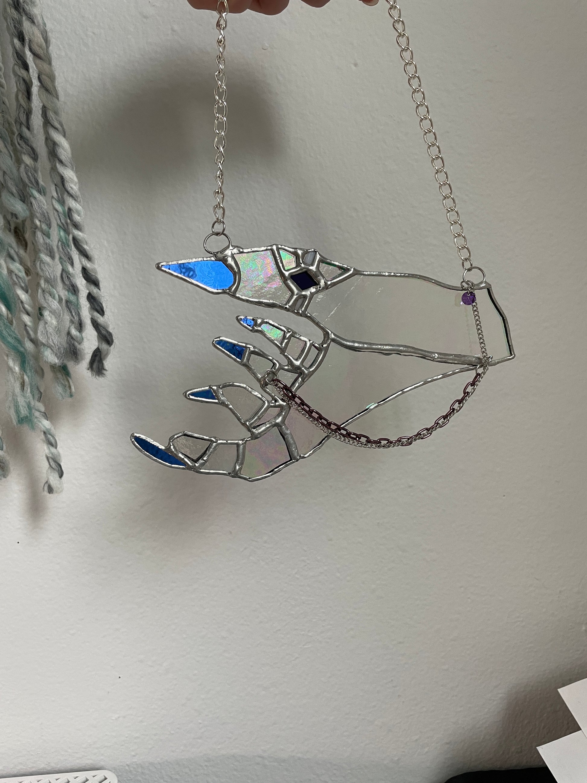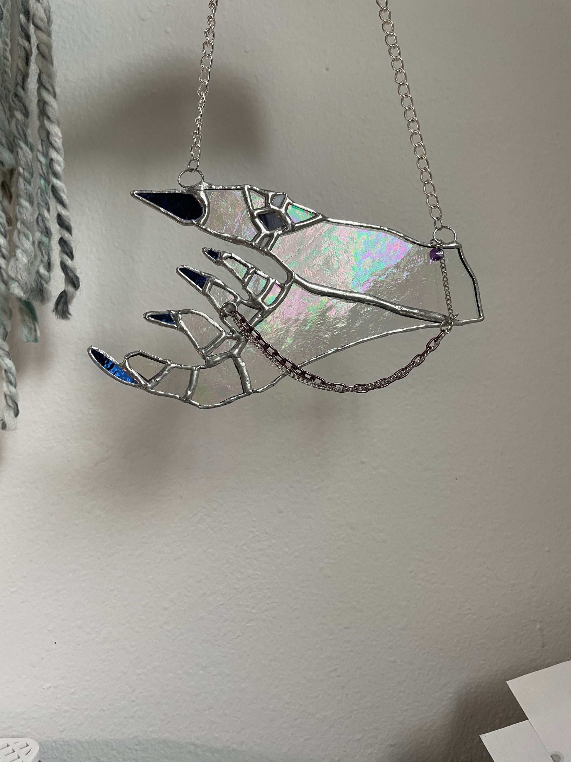 Beautiful iridescent spooky hand. With chain and gemstone wristlet detail and purple dichromatic nails to add some shimmer. Great additional to any gallery wall or alter corner.